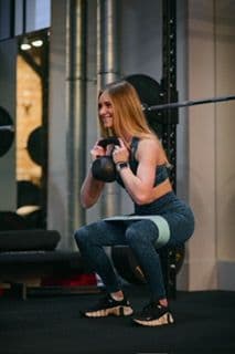 For this exercise, you will stand with your feet apart, face the anchor, and hold the ends of the resistance bands with your arms extended down by the sides. Now, lower yourself down in a deep squat and pull your backwards to your hips by keeping your palms facing backwards.